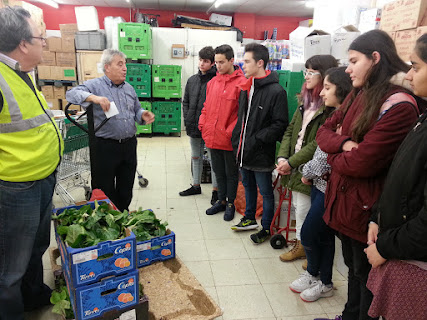 El mateix grup a la seu de Disa-Càrites reben l'explicació dels voluntaris sobre com s'organitza la distribució d'aliments i quin destí tindran les verdures que hem portat.