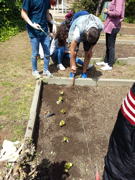 El grup d'alumnes voluntari amb les verdures de l'hort llestes per distribuir.